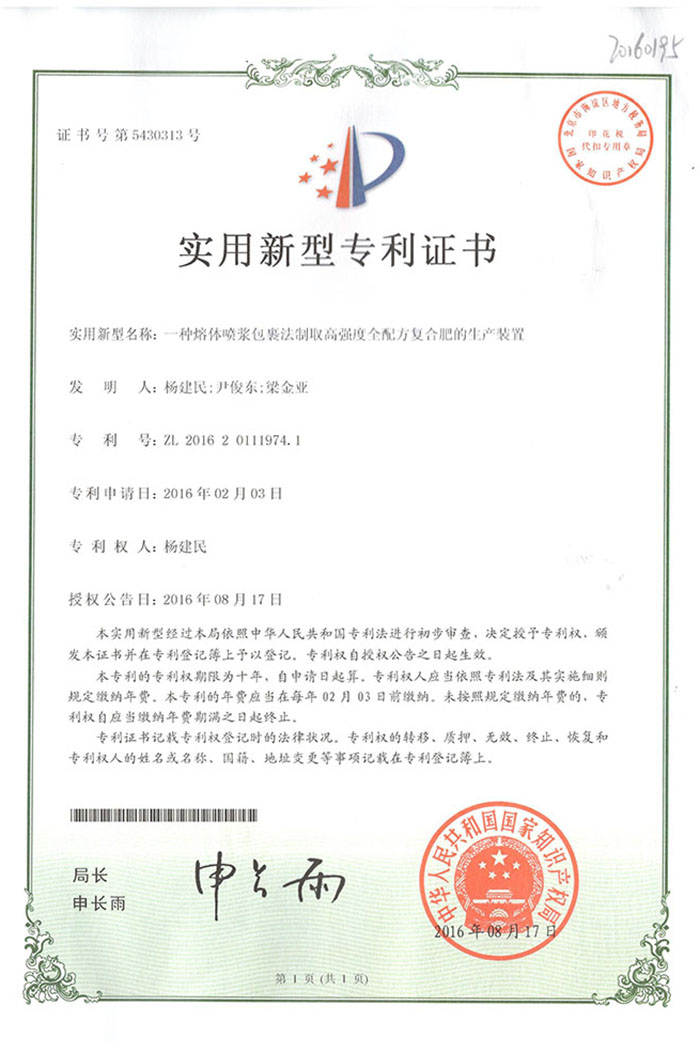 熱烈祝賀三門峽昊博化工工程有限公司又取得一項專利《一種熔體噴漿包裹法製取高強度全配方複合肥的生產裝置》,我公司本著化工裝備技術必須服從於化工工藝過程的需要,化工工藝過程與化工裝備技術達到完美和諧的統一的目標。 專心研發技術,實現技術、工藝過程和化工裝備的和諧統一,至今公司已取得近20項國家專利產品。